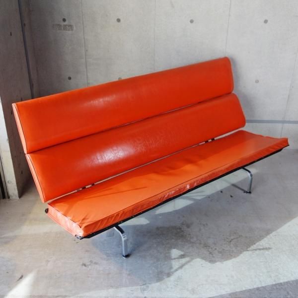 1954年、イームズ夫妻が自邸「イームズハウス」用に作製したソファを元にデザインされた「ソファコンパクト」。輸送のために背を折りたたんでその名の通りコンパクトに収納する事が出来き、搬入が難しい場所への設置も楽に可能なことから、日本でも大変人気があるソファです。そのシンプルな見た目ながら、リラックスできる座面の角度やハイバックの背もたれなど座り心地にも非常に優れています。