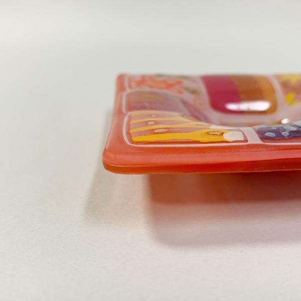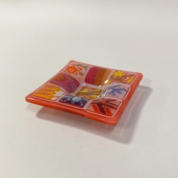 色を付けたガラスに様々な装飾を施したのち、さらにその上にガラスを乗せて挟み込んで仕上げるスランプガラスと呼ばれる珍しい製法。