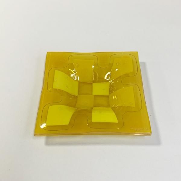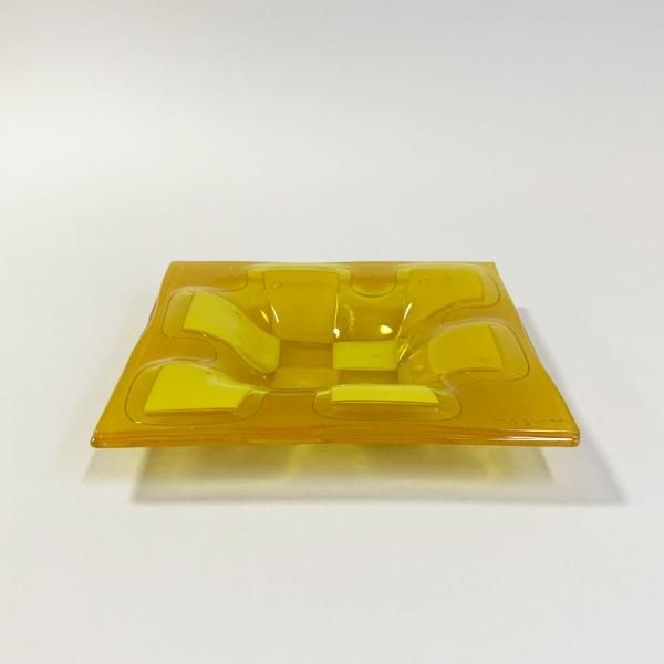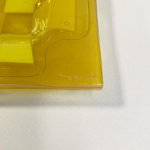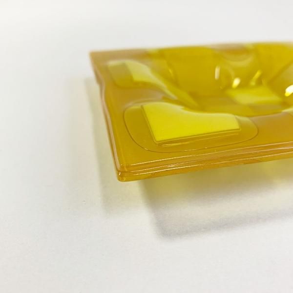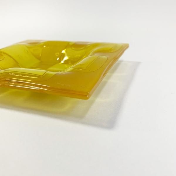 色を付けたガラスに様々な装飾を施したのち、さらにその上にガラスを乗せて挟み込んで仕上げるスランプガラスと呼ばれる珍しい製法。
