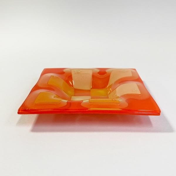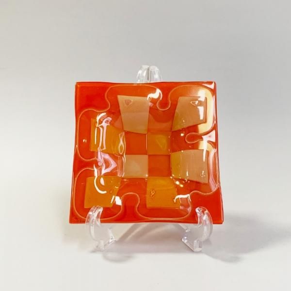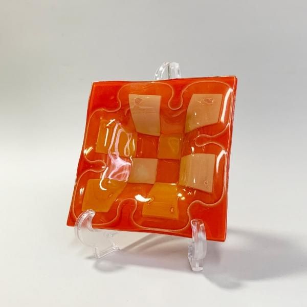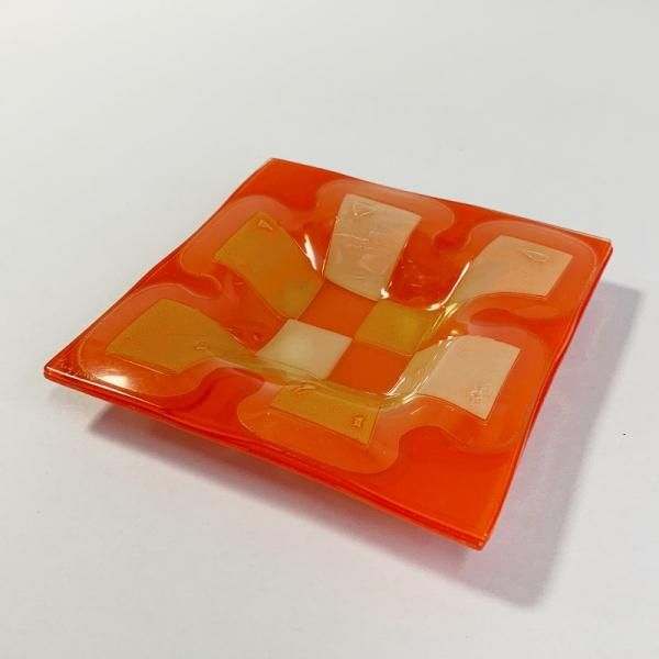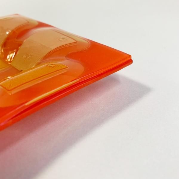 色を付けたガラスに様々な装飾を施したのち、さらにその上にガラスを乗せて挟み込んで仕上げるスランプガラスと呼ばれる珍しい製法。