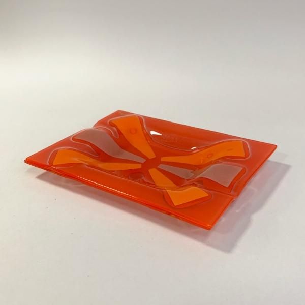 色を付けたガラスに様々な装飾を施したのち、さらにその上にガラスを乗せて挟み込んで仕上げるスランプガラスと呼ばれる珍しい製法。
