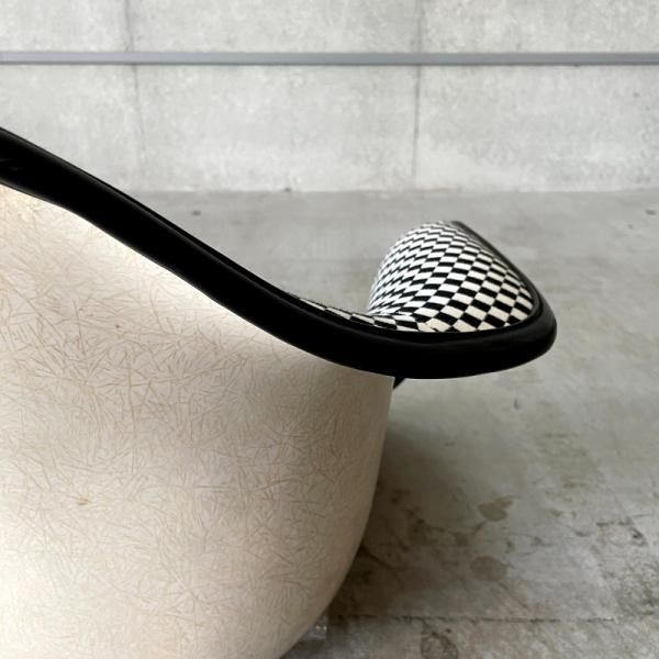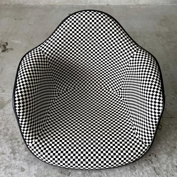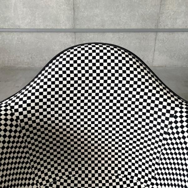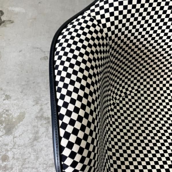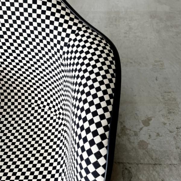 ヴィンテージのイームズ・アームシェルチェアに、ミッドセンチュリーの代表的なデザイナーである、Alexander Girard(アレキサンダー・ジラルド)がデザインを手掛けた、maharam(マハラム)社のChecker(チェッカー)を新しく張り込んだ1脚。